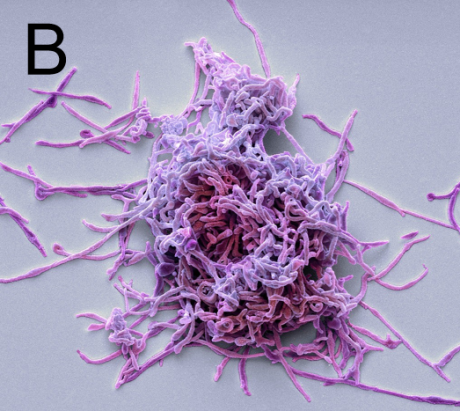 A:生殖支原体透射电镜照片[4],B:肺炎支原体扫描电镜照片[5]