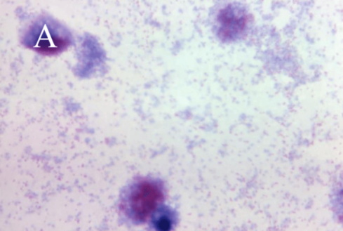 衣原体严格细胞内寄生,可用鸡胚卵黄囊接种、易感动物(如小鼠腹腔)接种及传代细胞分离培养。衣原体在宿主细胞内增殖,细胞化学组分和结构与革兰氏阴性菌相似,其细胞壁为含胞壁酸的外膜,含RNA和DNA,繁殖为二分裂,用光镜可观察到两种形态,即原体(EB)和始体(RB)。原体呈球形,致密,体积小,直径为0.2-0.4 μm,有细胞壁,是发育成熟的衣原体,革兰氏染色呈阴性,吉姆萨染色呈紫色,麦氏染色呈红色。始体呈球形,无细胞壁,疏松,体积较大,直径为0.5-1.0 μm,为纤维网状结构,麦氏染色呈蓝色。在易感细胞内含有繁殖的始体和子代原体的空泡,被称为包涵体,它具有多种不同的形态,对衣原体的鉴别有意义[3]。