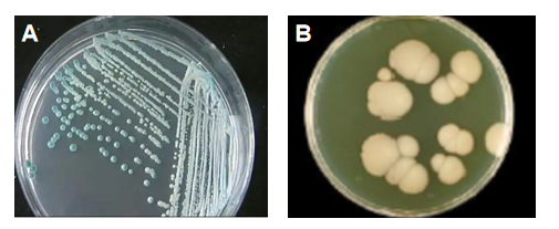 A:沙氏葡萄糖琼脂下的白色念珠菌,B:沙鲍弱氏琼脂下的白色念珠菌