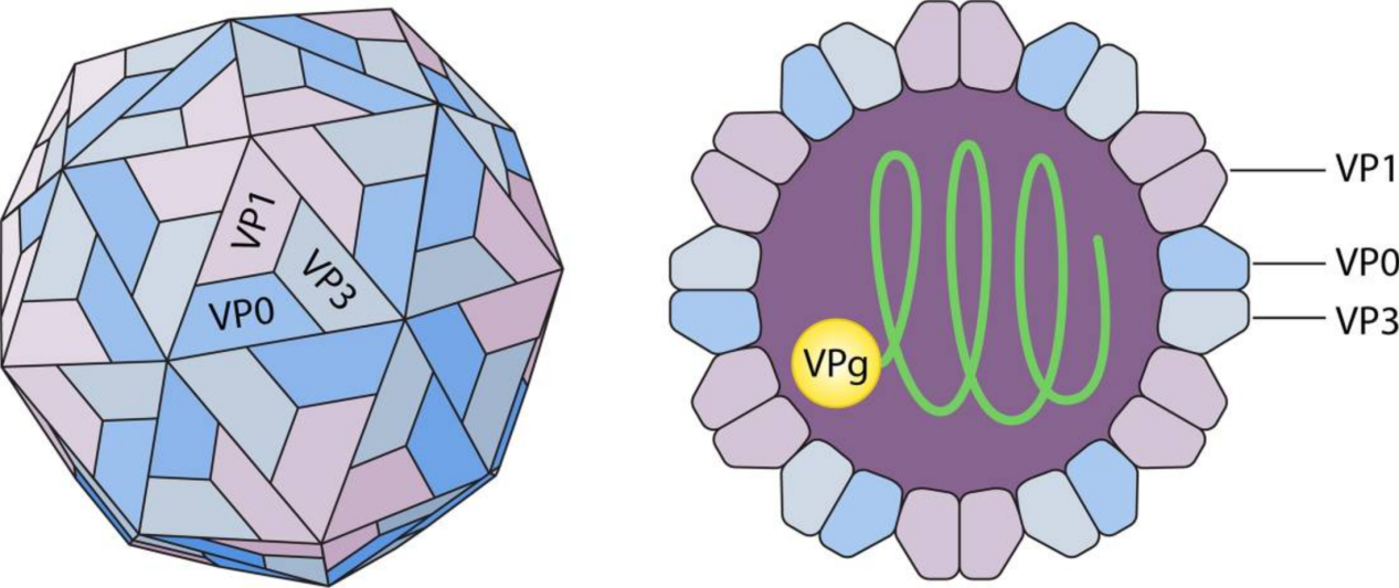 人副肠孤病毒颗粒呈球形,直径大约是28 nm,无包膜,全长大约7300个核苷酸,为单股正链RNA病毒。HPeV衣壳由60个原聚体结构组成,衣壳蛋白呈二十面体立体对称。HPeV基因组分为四个不同的区域:一个长开放阅读框(ORF),一个5’非翻译区(5′-UTR),一个3’非翻译区(3′-UTR)和一个polyA尾。ORF由3个区域构成(P1、P2和P3),P1区包括3个衣壳蛋白(VP0、VP3和VP1)、P2区包括3个非结构蛋白(2A、2B和2C)和P3区包括4个非结构蛋白(3A、3B、3C和3D)[2]