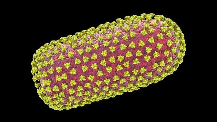病毒粒子呈子弹状,长约130-300 nm,直径约75 nm;外被脂质包膜,表面密布糖蛋白G刺突;核衣壳内含单股负链RNA(约12 kb),与核蛋白N紧密缠绕形成螺旋对称结构[3]。电镜下可见一端平截、一端圆滑,形态特征明显。