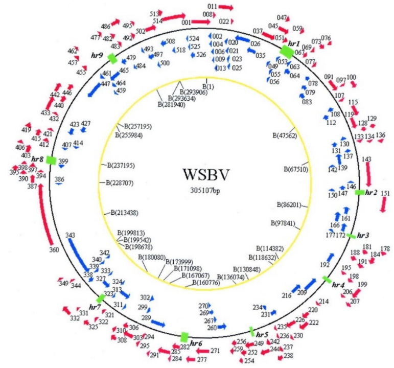 过去30年间,已有超过10株WSSV基因组被测序,包括中国大陆株(WSSVCN)、泰国株(WSSV-TH)、台湾株(WSSV-TW)、韩国株(WSSV-KR)、澳大利亚株(WSSV-AU)及厄瓜多尔株(WSSV-EC-15098)等[2]
